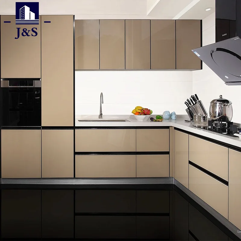 Zasnova v obliki črke L, vrata montažne kuhinjske omare v steklenem slogu so zasnova omare s steklenimi vrati, v čokoladni barvi, brez ročaja, s pultom iz belega kremenčevega kamna, preprosta zasnova, ob predpostavki, da ustreza funkciji omare, prihrani veliko prostora. zaradi česar je moderen in okolju prijazen PET material bolj kakovosten. Kombinacija bogate teksture čokoladno sive barve s tridimenzionalnim reliefom senc in sistema osvetlitve s pridihom tehnologije daje prostoru raziskovanje življenja prihodnosti.